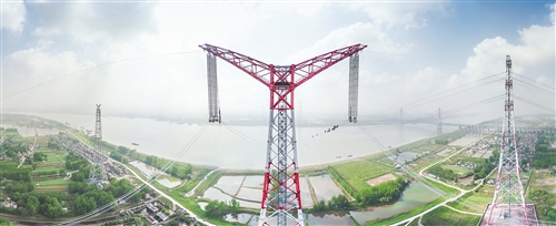 这是导线展放后的昌古特高压长江大跨越工程北岸跨越塔(4月15日无人机拍摄)。 随着西电东送±1100千伏“新疆准东—安徽皖南”特高压直流工程的最后一相导线顺利跨越天堑长江,世界电压等级最高的特高压大跨越——昌古特高压长江大跨越工程全线贯通